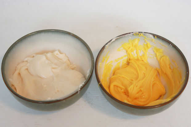 Sacar cerca de un tercio del relleno y mezclar en algunos colorante amarillo. Ahora listo!