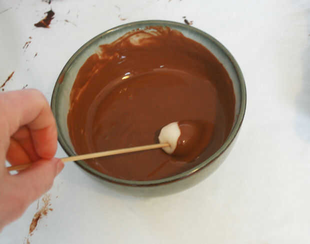 Ya sea inmersión rellenos en el chocolate con un tenedor y dejar que el pergamino, o pinchar los rellenos y les sumergen así (a'la cake pops).