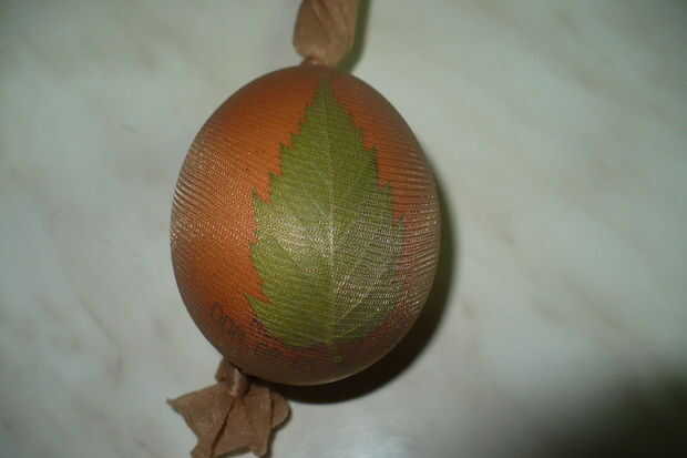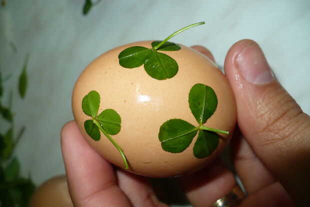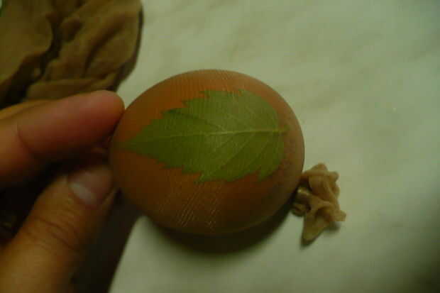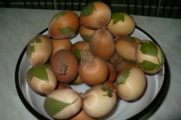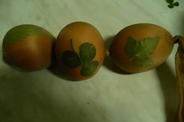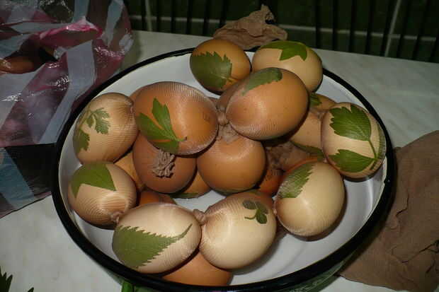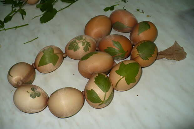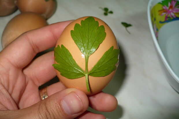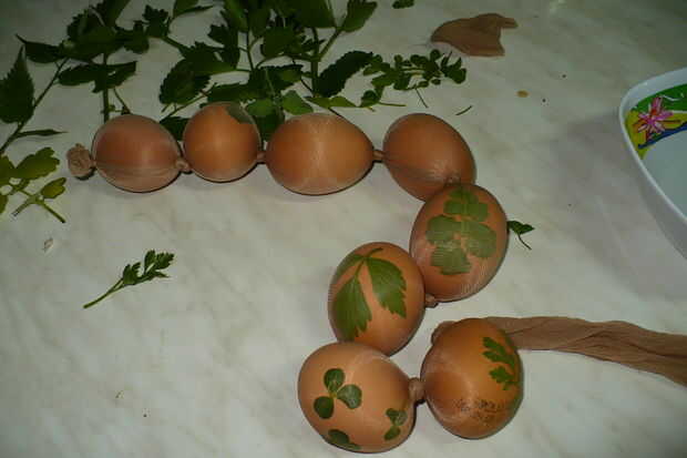 Tomar algunas pequeñas hojas y usar agua para pegar a los huevos. Esto mantendrá las hojas en su lugar mientras inserta los huevos en las medias. Asegúrese de strach la panthyhose tanto como usted puede antes de hacer un nudo. De esta forma la cáscara del huevo se expone mejor el color.