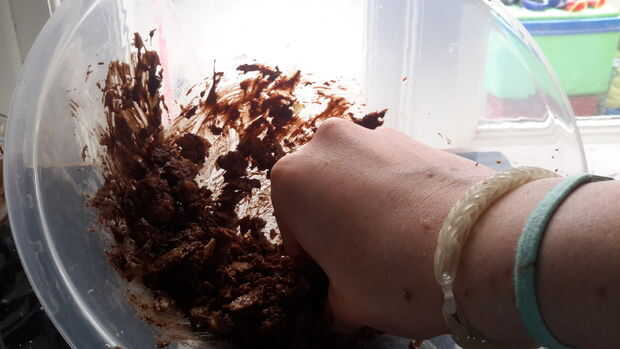 mezclar las patatas con las manos para hacer una mezcla espesa de aburrido