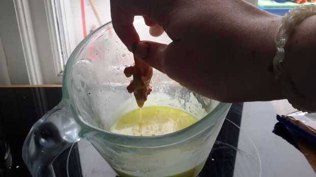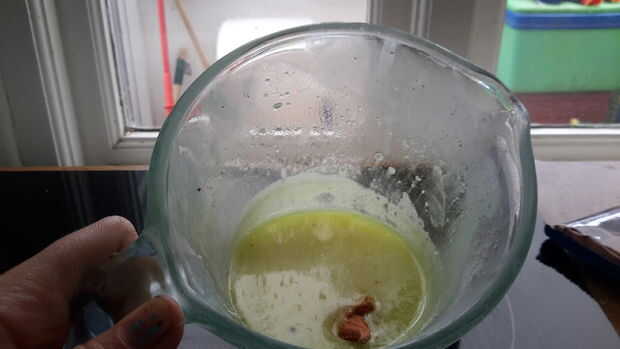 sumerge el juguete en la mezcla de amarillo (esto hace que el juguete pegajoso para que el chocolate se pega a él.)