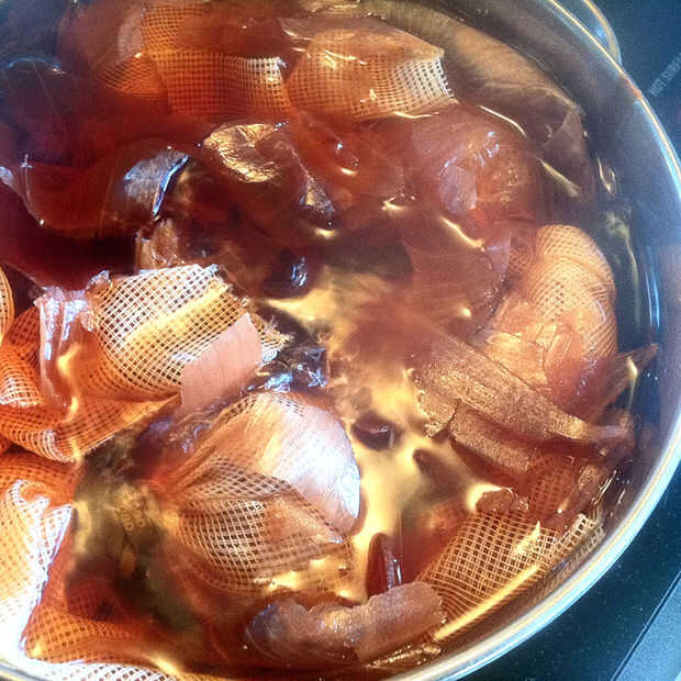 Paso 2: Cocer a fuego lento cubierto en una cacerola de acero durante 30 minutos con las pieles de cebolla adicional y abundante agua.