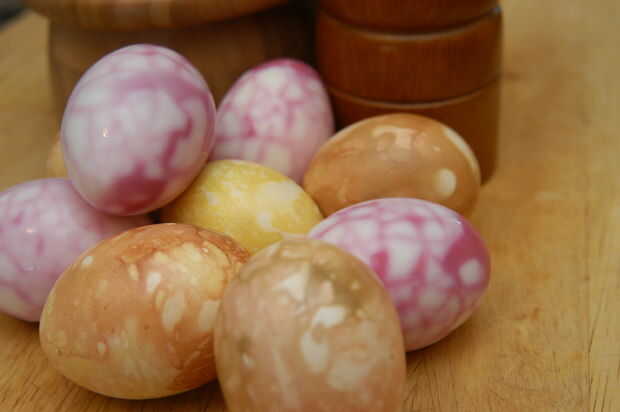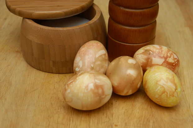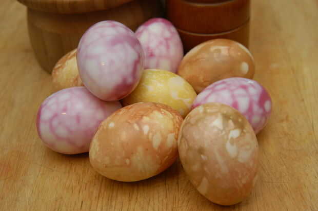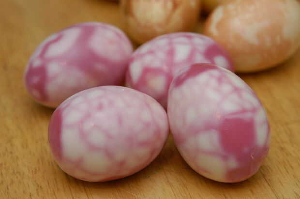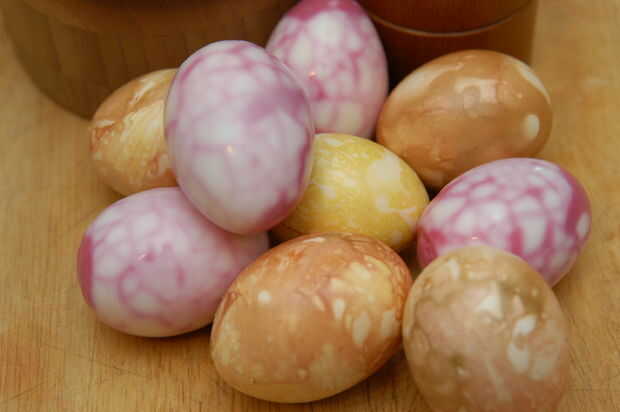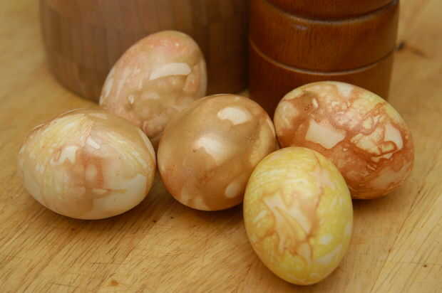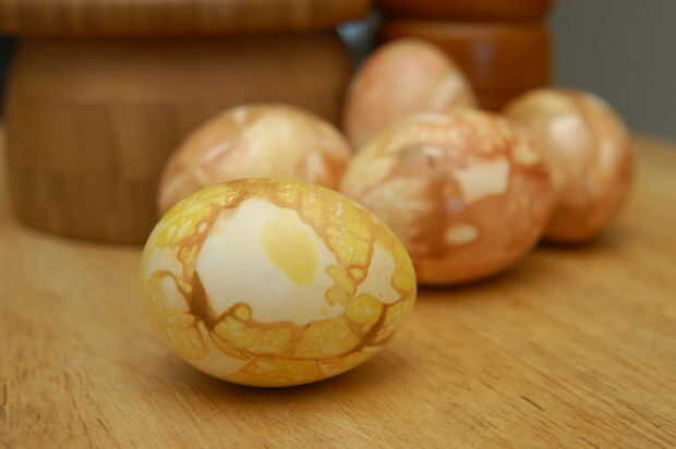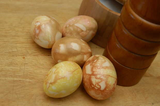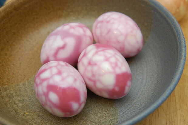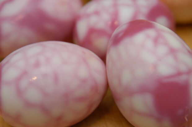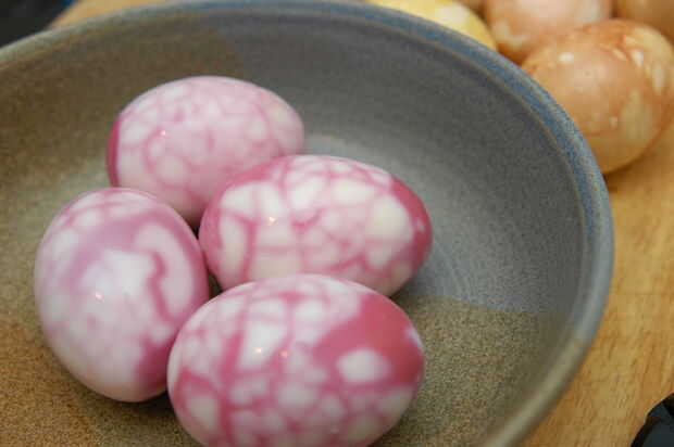 Se realiza envolviendo los huevos en las pieles de cebolla antes de hervir. Aquellos son los marrones, ámbar y amarillo. Los de color de rosa/púrpura/rojo ya se pelan en las fotos, y se hacen por agrietar las cáscaras de los huevos duros previamente todo tipo de les crujido suavemente sin pelar y luego remojar en el té (o en mi caso, jugo de remolacha) para aproximadamente una hora y luego pelar.
