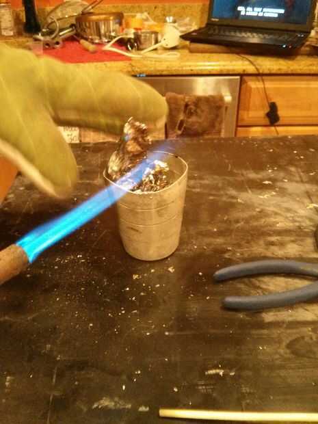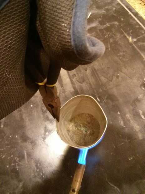 Bismuto se funde a una temperatura relativamente baja para un metal en 520,6 (271,4 ° c.). Puede lograrse fácilmente con un soplete de propano. Calentar el metal hasta que se haya derretido. Escoria se suben a la superficie. Una vez que el metal es todo líquido raspar la escoria apagado con el raspador de metal. La superficie del metal es plata para un a corto plazo y entonces rápidamente se convertirá en tonos naranja, amarillo, verde, azul y púrpura. Se trata de diferentes espesores de óxido de bismuto, formando en la superficie del metal fundido. Siempre me sorprende por el metal fundido que bonito es.