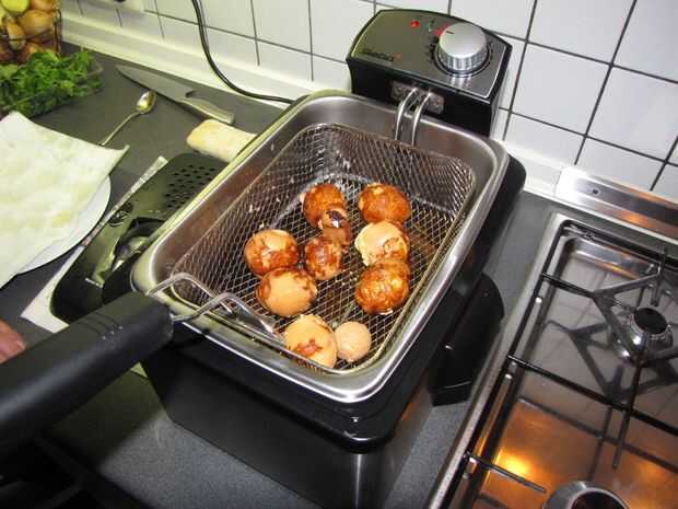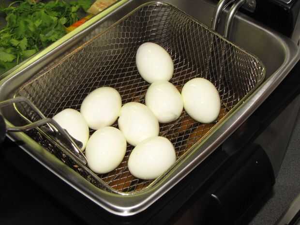 Quitar la cáscara del huevo de los huevos cocidos y se fríen. También se puede utilizar una sartén. Están listas cuando se ven de color amarillo dorado.