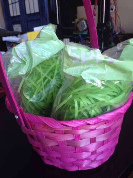 Para algunos toques finales, hemos decidido obtener una canasta de Pascua barata ($1,50 en el destino) y algunos de eso césped decorativo (1,00 $ en destino) y establecer una canasta de Pascua para dejar fuera a nuestros amigos confiados.