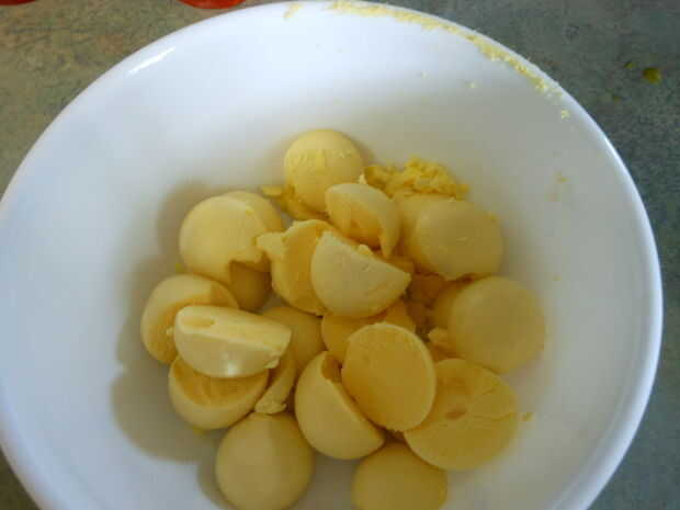 huevos picante, ahumadas... Diablo verdaderoPaso 1: preparar Ingredientes:-huevo duro (cortar por la mitad y sacado con pala)-japonesa mayo-pimienta de Cayena-Español ahumado pimentón-panchetta o tocino-mostaza de dijon-vinagre blanco-escamas del Chi