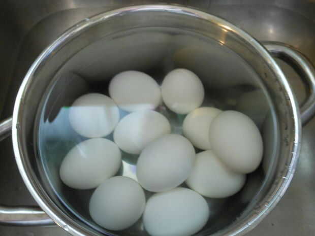 Cubrir los huevos con agua y ponerlos en la estufa, medio alto y ponga la tapa en. Aquí está la lección de ciencia de alimentos #1: las tapas tiene el calor/vapor en la olla para que se necesita menos energía para conseguir el agua hasta ebullición, sabes que esto es cierto porque una vez la tapa de todo el vapor sale, entonces tienes que empezar a recoger vapor todo otra vez. sí, esto es una gran manera de ahorrar energía. .