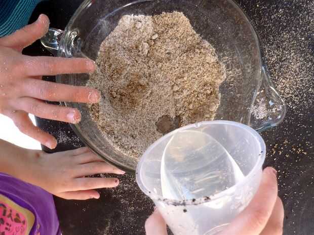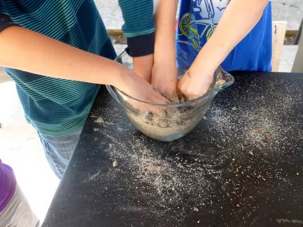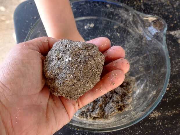 Los niños mezclan los componentes del dinosaurio huevos después se añade el agua, y sabíamos que estaba listo cuando éramos capaces de aplastar la mezcla en la mano y se quedó junto. Más agua haría lo mismo, pero una vez más, los huevos de dinosaurio no seca tan rápido como yo en este Instructable.