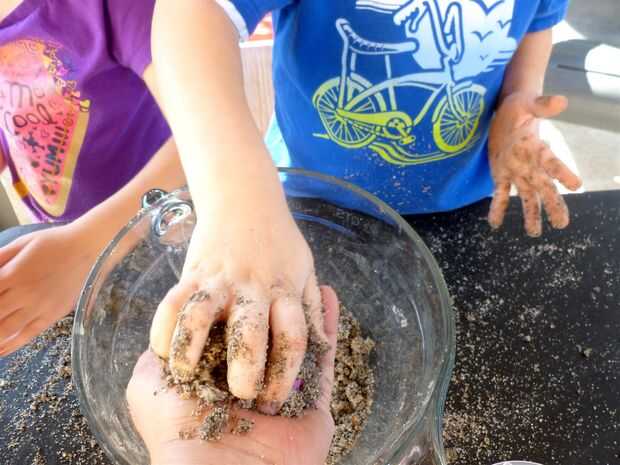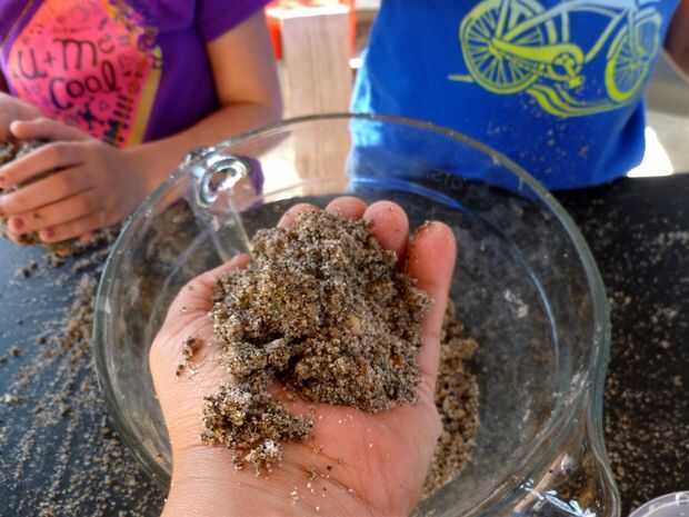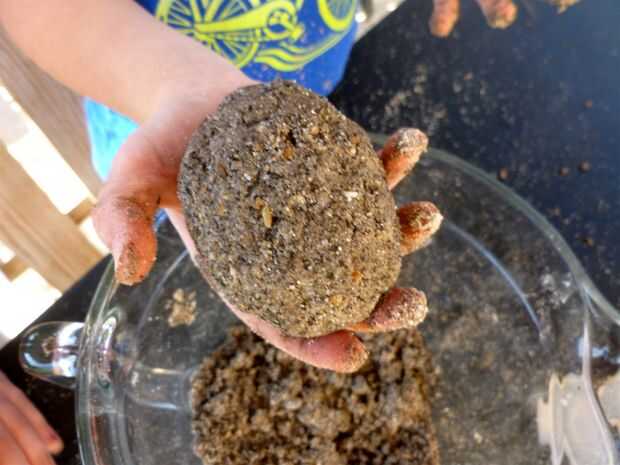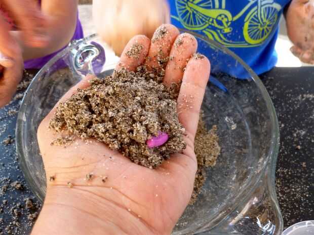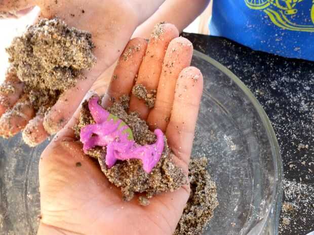 Seguir añadiendo la harina, sal, arena y café mezcla de motivos y forman en un huevo para cubrir completamente el dinosaurio.