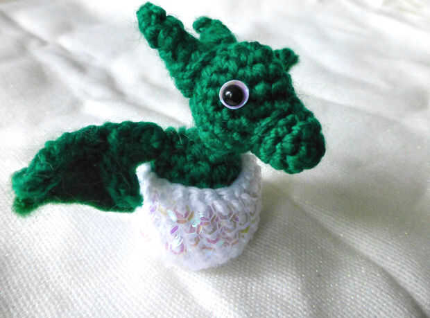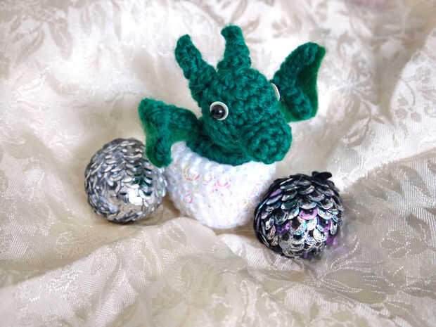 Ahora me gusta dragones, pero no tengo el tiempo para hacer otro de estos. Yo quería hacer algo un poco más pequeña así que decidió en un dragón del bebé de eclosión de un huevo. La persona que pidió el dragón tiende a usar un montón de cosas brillantes, brillantes, así que quería incorporar lentejuelas en este proyecto. Usé las lentejuelas como escamas en el huevo. Además del mitad-huevo con el dragón eclosión fuera de ella, también hice dos huevos enteros (aunque un poco más pequeño) con lentejuelas metálicas.