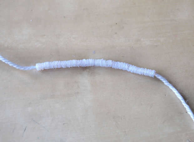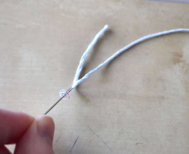 Usé una aguja de coser con un ojo grande (lo suficientemente grande para el hilo de rosca 3 peso), la aguja también debe ser estrecho para pasar por el agujero de la lentejuela. Hilo de lentejuelas de la cóncava lateral (ver imagen de arriba). Una vez todas las lentejuelas han sido roscados, bajar en un montón de espacio para empezar a tejer, luego avanzar cada lentejuelas individualmente según sea necesario.