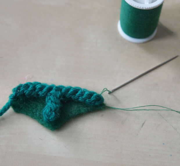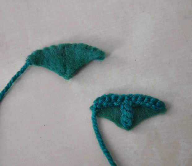 Cortar dos piezas de fieltro verde de la misma forma que las alas. Coser el fieltro a la parte posterior de cada ala con hilo de coser.