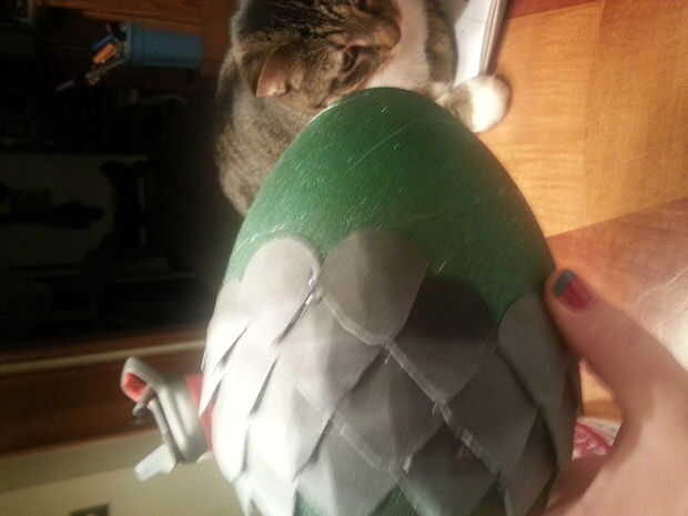 Pegamento en las escalas. Comience por la base más ancha y hacer a cada escala se superponen ligeramente en una fila. Trabajar alrededor de la base todo que estén en línea incluso agradable. Comentar pero se puede medir para asegurarte.