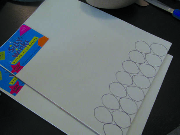Para crear las escalas para cubrir los huevos comienzan cortando en forma de un trozo de papel (preferiblemente pesada). Decidí crear una forma redondeada del huevo. Una vez que esté satisfecho con la plantilla de escala se usa para rastro más en sus hojas de papel de la espuma. (Cantidad necesaria dependerá de la colocación de las escalas)