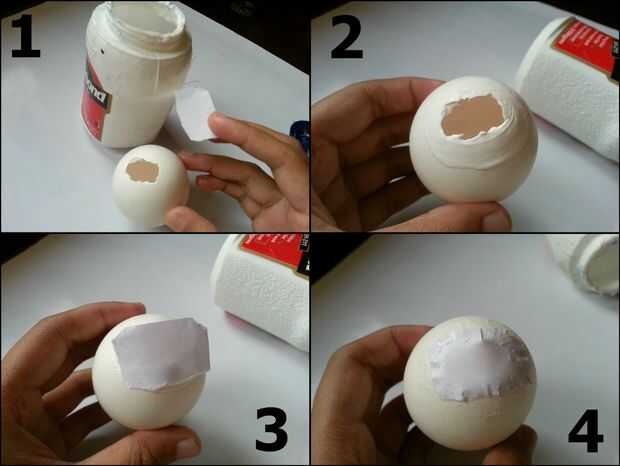 Después el huevo se seque tomar un pequeño trozo de papel, el área alrededor del diminuto agujero en el huevo del pegamento y pegar el papel pequeño en ella (para cubrir el agujero).