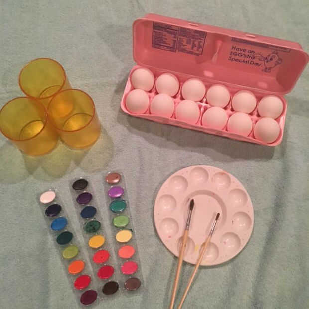 Para este proyecto, sólo necesitas un par de cosas. Lo más importante, necesita huevos (no olvidar aquellos!), luego acuarela, uno o dos pinceles, una paleta para mezclar (opcional) y unas tazas para el lavado y la adherencia de soldadura. Una vez que haya terminado de configurar hervir los huevos durante unos 7 minutos.