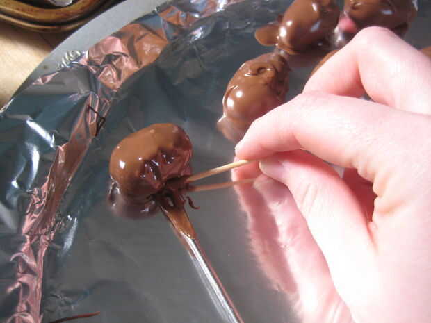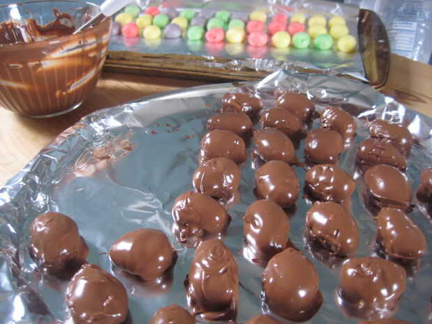 Repita el proceso de sumergir los huevos en el chocolate derretido hasta que los huevos están recubiertos. Volver los huevos a la nevera y enfriar hasta que el chocolate se establezca.