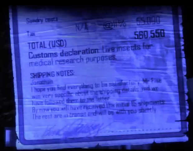 Una vez la contraseña, se abrirá la escotilla. Si vas, cambiará al modo primera persona y verás muchas cajas de cucarachas en los estantes. Ir hasta el final del barco donde el interno está sentado en la silla. Si mira directamente al interno, desmadrarse y luego mueren. Mire a su izquierda. Debería ver una carta al Doctor Johnathon Crane.
