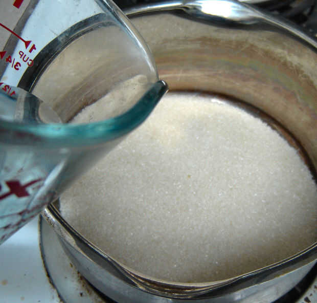 - Medir azúcar partes iguales granuladas y el agua y colocar en una olla en la estufa. Usé un cuarto de taza de cada uno que era más que suficiente. Mejor usar azúcar refinado, sólo tenía azúcar orgánico en casa que no era un blanco puro que puede contar con color el hilo un poco más oscuro.