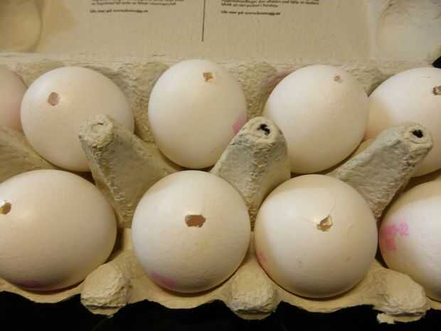 Soplar la contiene de los huevos. Sólo hay que poner los labios para el agujero pequeño del huevo y golpe la contiene en un recipiente. No olvide tirarla - puede utilizar los huevos para hornear o cocinar (he hecho una tortilla enorme!).