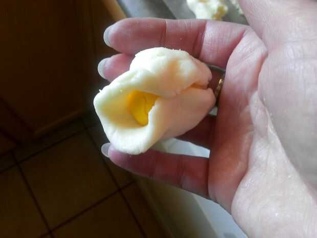Suavemente Envuelva el fondant blanco alrededor de la yema para cubrirlo totalmente. Moldear con las manos para hacer una forma de huevo