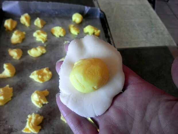 Aplana un trozo de fondant blanco en su palma y coloque un pedazo de fondant de colores en ella (parece un huevo frito)