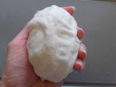 Espolvorear la fibra envuelto huevo con agua jabonosa tibia y usando sus manos, trabajar el agua en la fibra. Una vez que se moje completamente, puede Agregar rayas de hilo Si quieres. Mojar el hilo