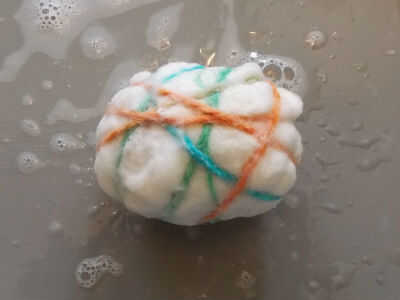 Espolvorear la fibra envuelto huevo con agua jabonosa tibia y usando sus manos, trabajar el agua en la fibra. Una vez que está totalmente abierto hacia abajo, puede Agregar rayas de hilo Si quieres. Mojar el hilo.