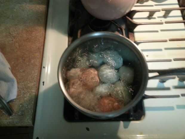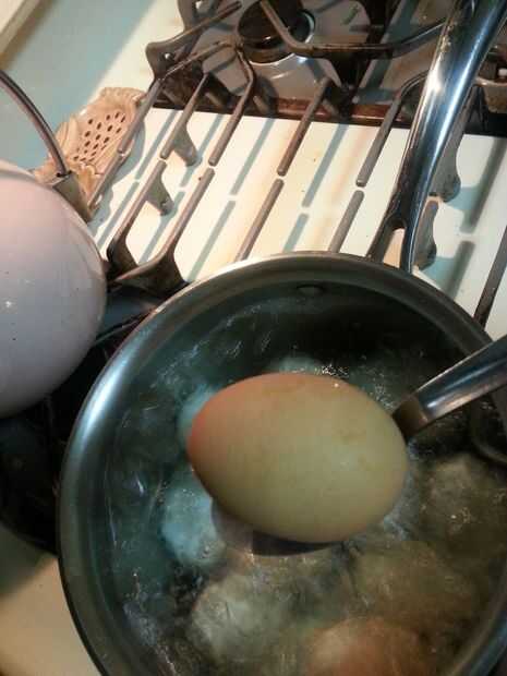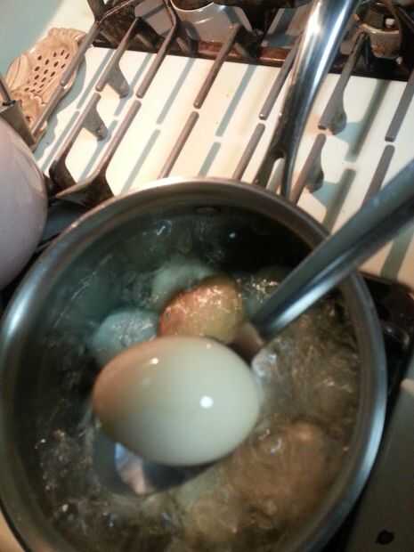Apague la estufa y quite la cacerola con cuidado volcar el agua caliente. Deje correr agua fría sobre los huevos en la cacerola hasta que estén suficientemente frías al tacto. Dejan enfriar completamente sobre una toalla.
