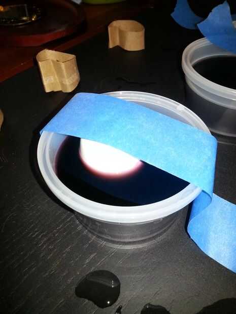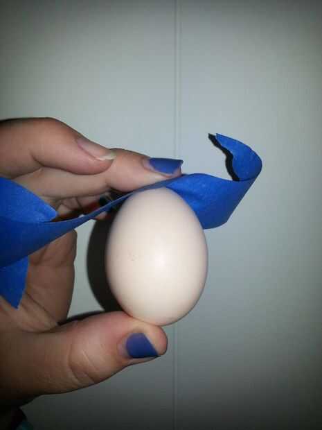 Uno por uno, con cuidado poner el huevo en el baño de color y cinta el huevo en la parte superior con cinta de enmascarar para que se sienta erguido. (ayuda a la parte superior central del huevo de la cinta primero y luego sumergir el huevo y presionar la cinta a lo largo de los bordes del plato).