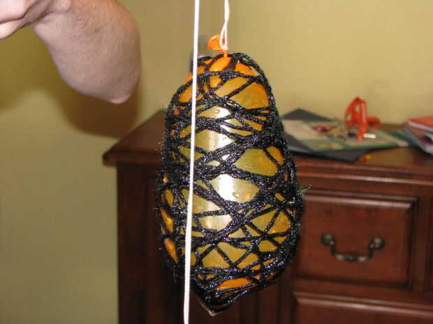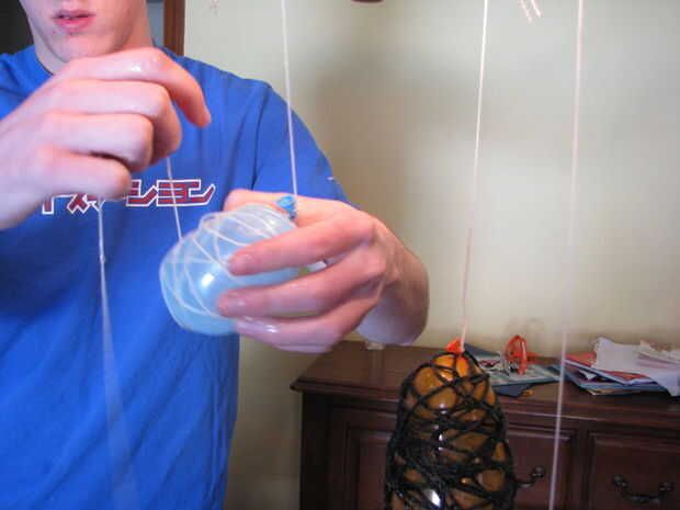 Comenzar a enrollar el hilo pegajoso todo sobre el globo, en un patrón entrecruzado para hacerla más fuerte. Más o menos ir tuercas envolver el hilo alrededor del globo hasta que se dirige.