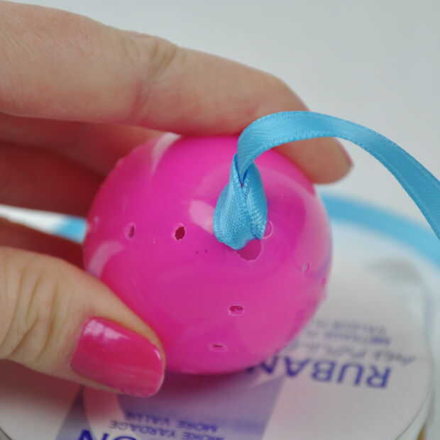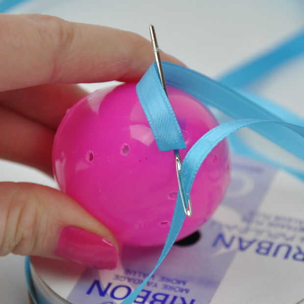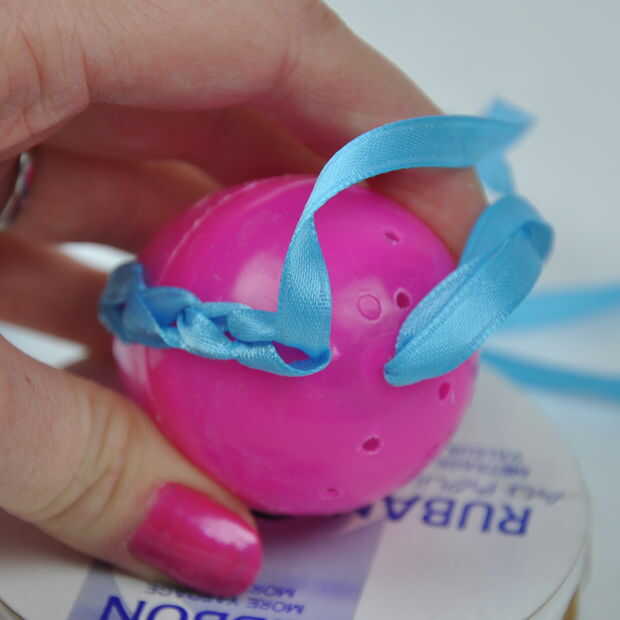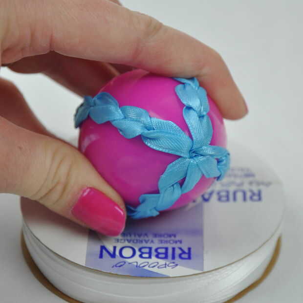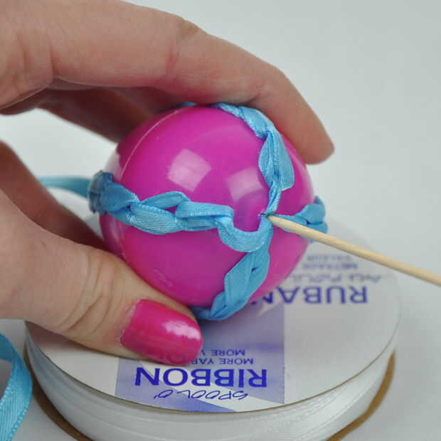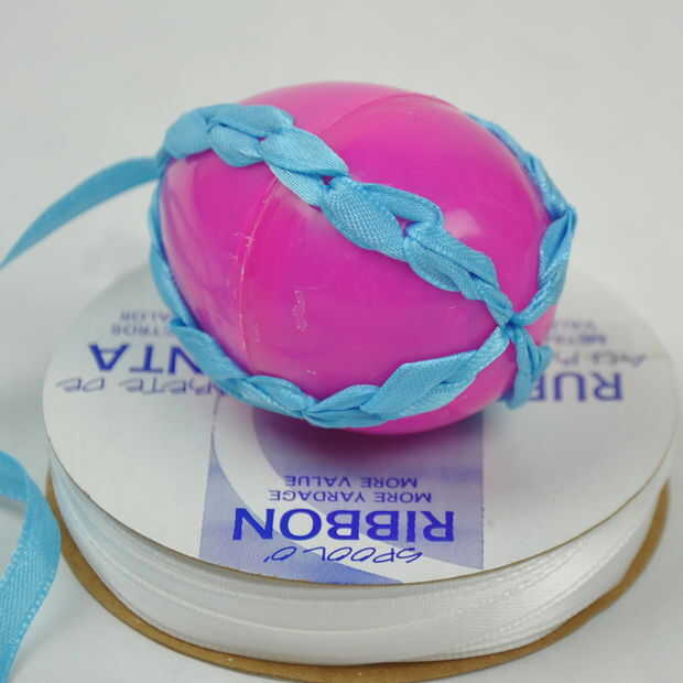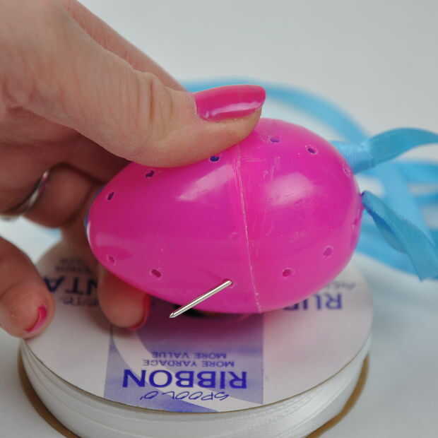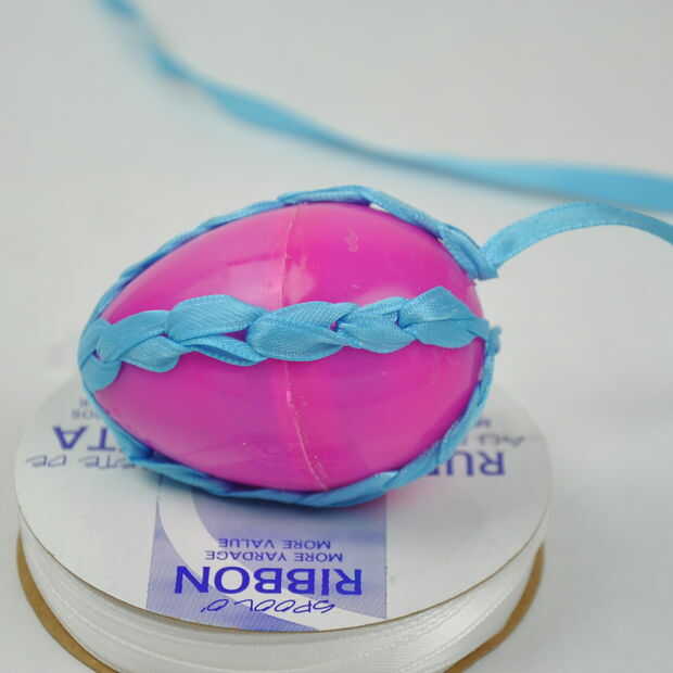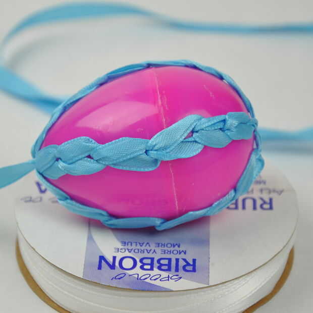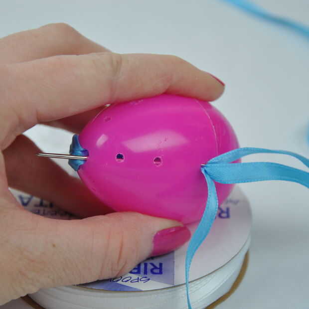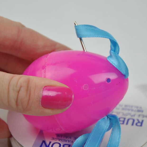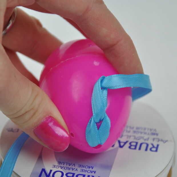 - He utilizado sobre un trozo de cinta de 90 pulgadas. Hilo en una aguja y tomar desde el interior hasta el exterior como con el otro huevo. Pegamento el interior de la cola en el interior del huevo. Lo hice para justo debajo de uno de los agujeros en la parte inferior. Presione contra el lado realmente bueno y deje que se seque.