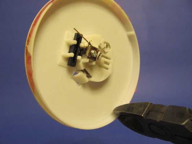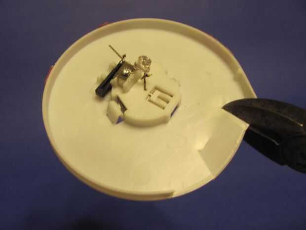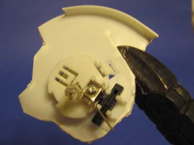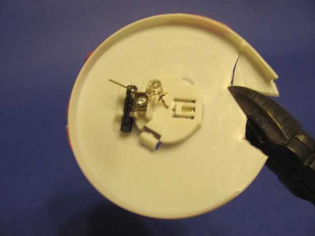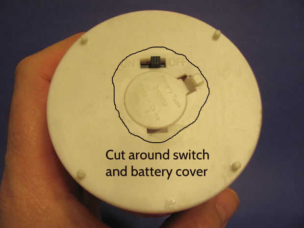 Utilice el cortador de alambre para cortar alrededor del compartimiento de batería y el interruptor. El plástico es tan barato que si usted toma pequeñas 'mordidas' sólo se encaja a presión apagado. Tenga cuidado de protegerse los ojos. Puede usar una sierra de marquetería o una sierra de banda si lo tienes pero las cuchillas funcionan bien.