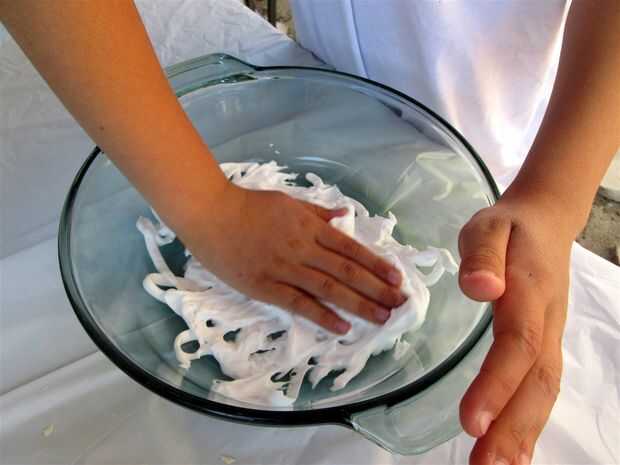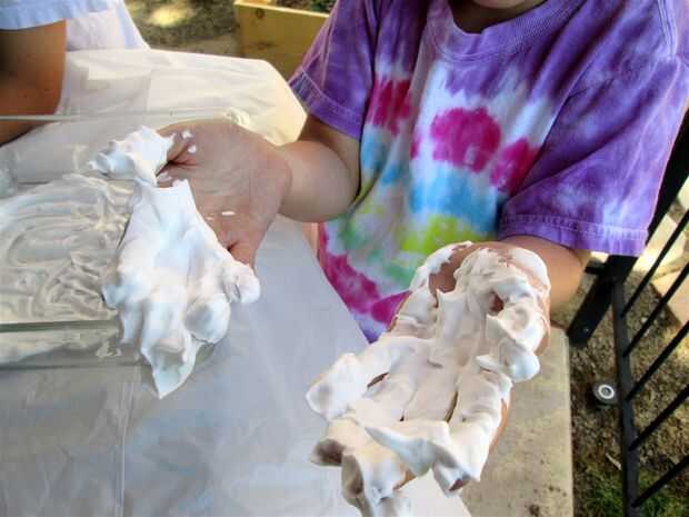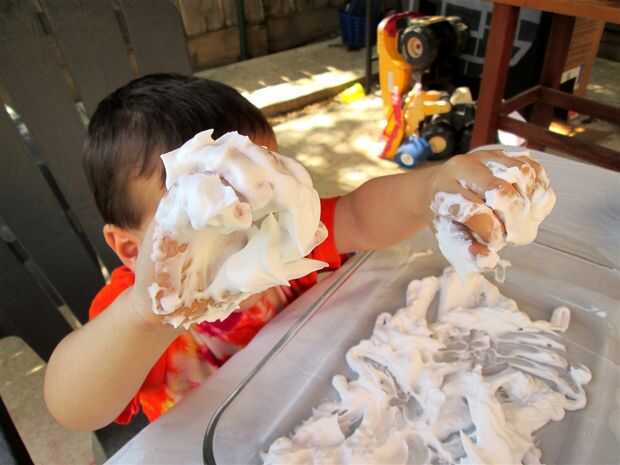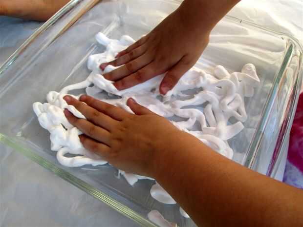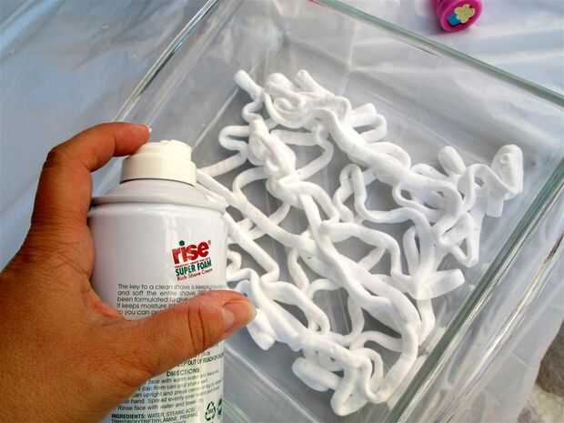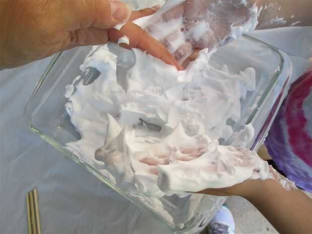 Rociaron algunos más crema de afeitar en los espacios más vacíos en el plato más grande sin moverla, para llegar al siguiente paso.