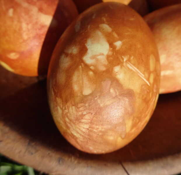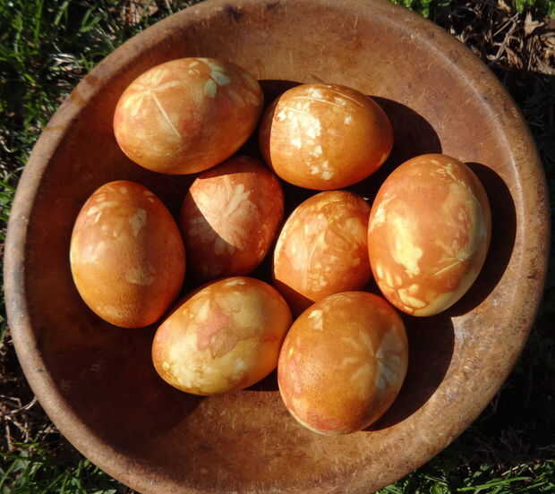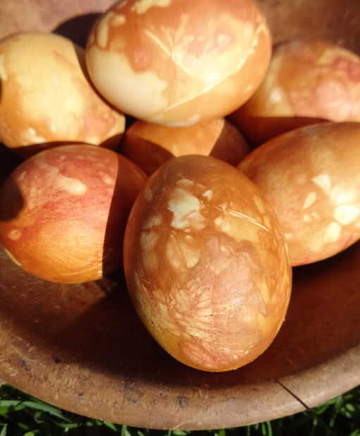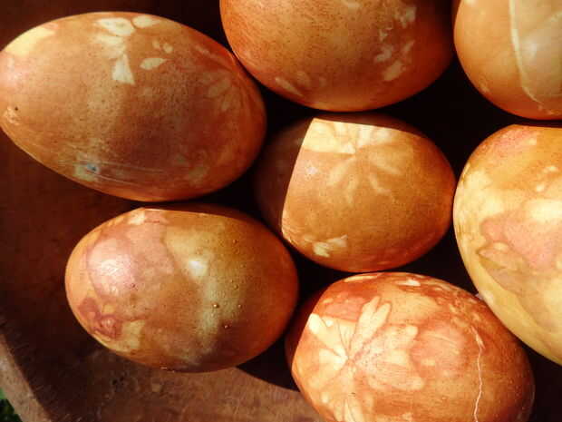 Huevos de Pascua teñidos holandés con las pieles de cebolla y flores