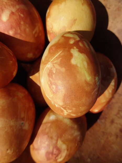 solo quería mostrar y contar mi primer intento en el método de piel de cebolla como se describe en este gran instructable:Se realiza envolviendo los huevos en las pieles de cebolla antes de hervir. Aquellos son los marrones, ámbar y amarillo. Los de
