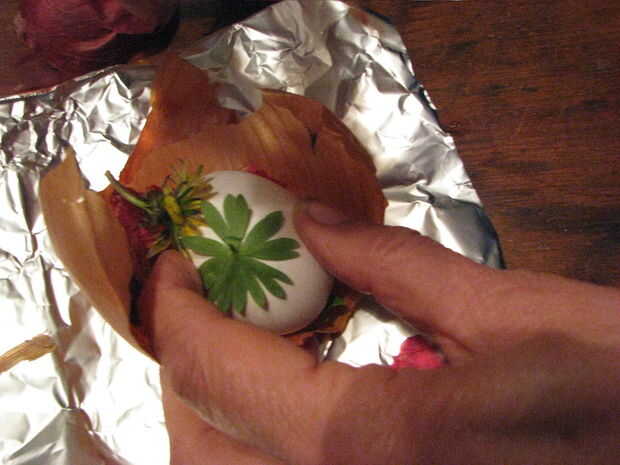 crear diseños únicos con las pieles de cebolla y huevos blancos. Cada uno es diferente y cada uno es una sorpresa!Paso 1:8 "cuadrados de tela, pieles de cebolla amarilla, huevos blancos, bandas de goma. Pieles de cebolla en el centro de los cuadrados