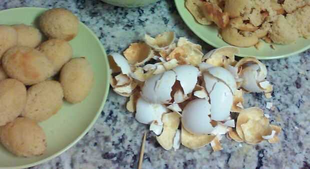 Dejar enfriar, cortar el pastel sobrante en cáscara de huevo (perfectamente buena para comer!) y gire suavemente los huevos para romper cascarón de huevo. Si la torta pega a huevo, use el cuchillo para aflojar suavemente y presione la masa en cuerpo de huevo.