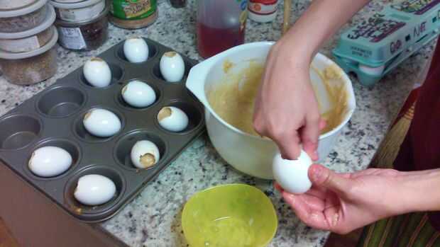 Vierta la mezcla en los huevos. Usé una cuchara de madera y los dedos también para raspar la mezcla sobrante de los lados de los huevos. Toque el huevo ligeramente contra su mano para eliminar bolsas de aire. No llenarlos completamente, como la masa se expandirá significativamente al hornear.