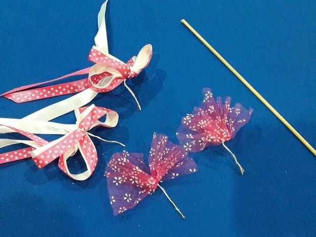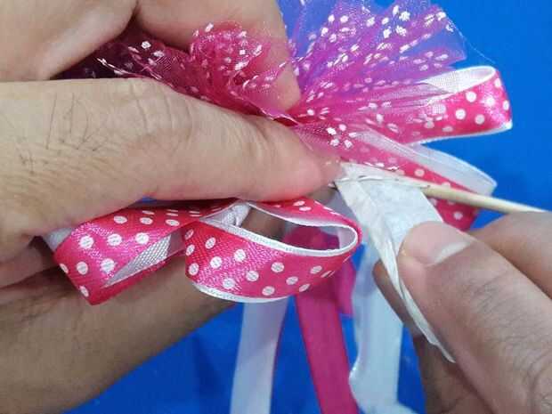 Organizar las cintas y los lazos de arco en la parte superior de la brocheta y asegúrela con una cinta.