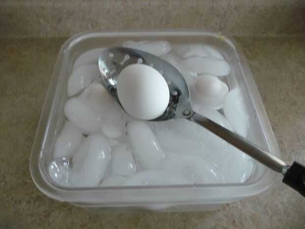 Usando una cuchara ranurada, coloque inmediatamente huevos cocidos en un baño de agua o hielo agua frío durante 3 minutos.