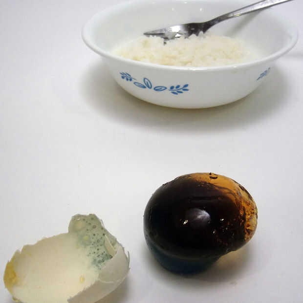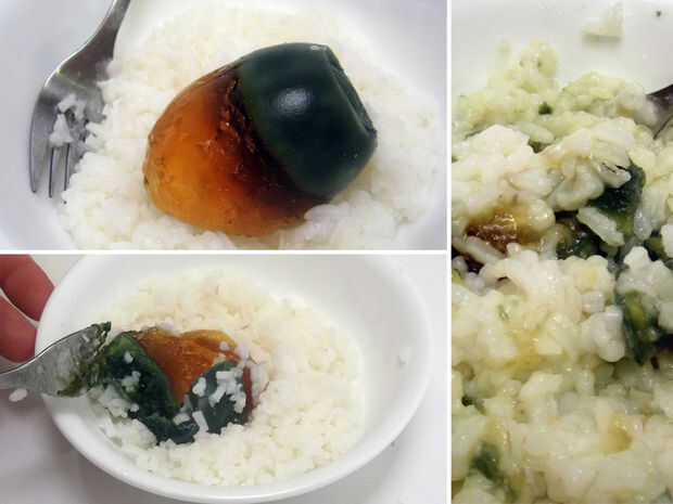 Huevos de siglo típicamente se sirven puré para arriba en arroz caldoso. Hice un tazón de fuente de vapor y sirvió a mis amigos.