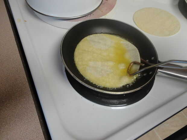 Coloque una sartén pequeña en medio alto y caliente el aceite. Con un par de tenazas dip tortillas uno a la vez a freír, pero no quebradizo; de 1 a 1/2 minutos.