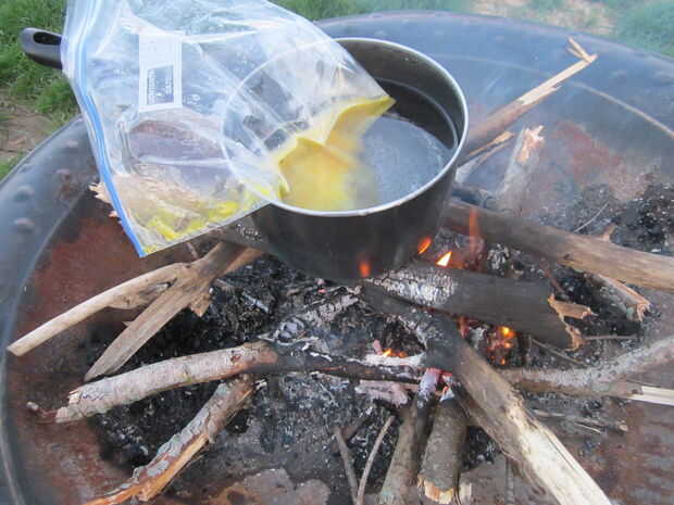 • Consejo: Tener la bolsa parcialmente llena de aire (no desinflado como se muestra en la imagen) le permitirá flotar en el agua, por lo que no tienes que brindar tu mano sujetando la bolsa en el bote sobre las llamas. Confía en mí, tostado a mano es no una experiencia agradable