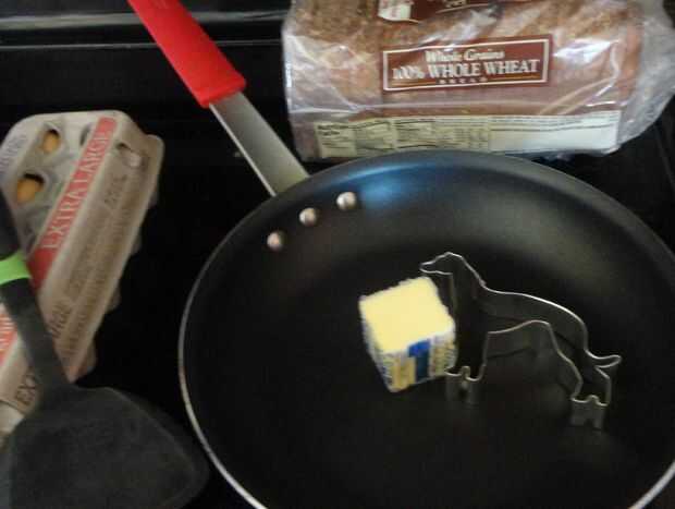 1 rebanada de pan, cualquier tipo 1 huevo 1/2 cucharadas de mantequilla Cortador de la galleta-que utiliza un perro para mi amor de esposos; le encanta galgos! Sartén Espátula de