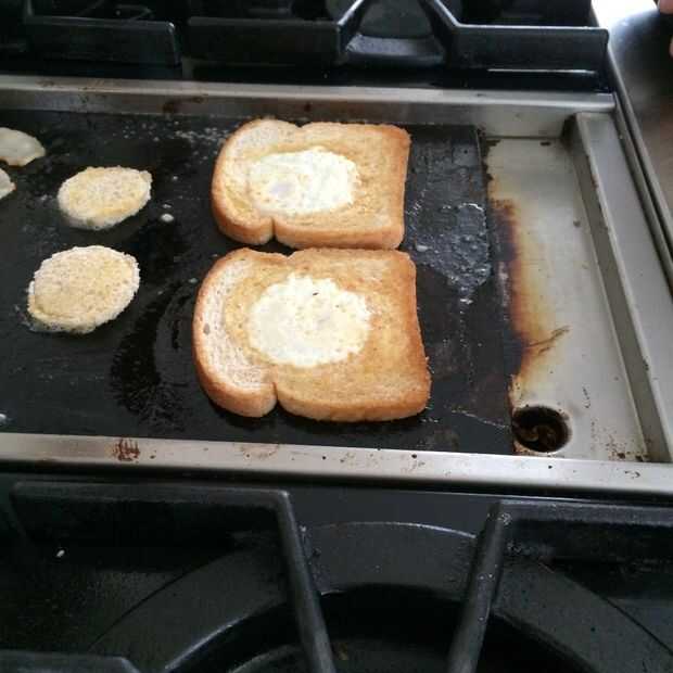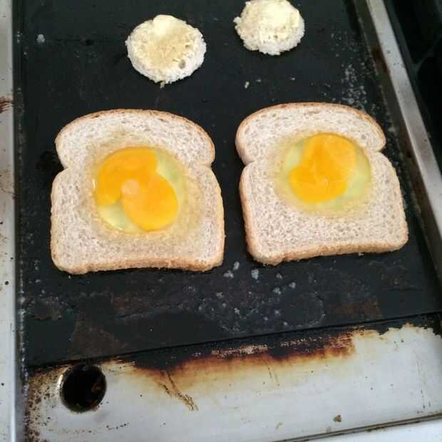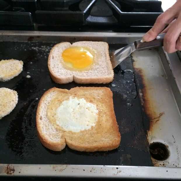 Usando la espátula para conseguir todo cocinando huevos en una cesta y dale la vuelta. es muy importante asegurarse de que la espátula en la parte de huevos porque, especialmente si te gusta la huevos mocosa, no se tapa con el pan y cocinar correctamente. dejar en la plancha/sartén cocer por aproximadamente la mitad del tiempo que previamente cocinado el otro lado.