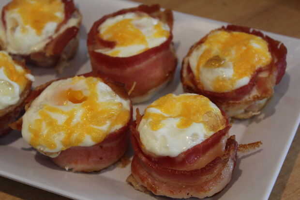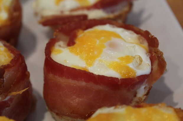 Colocar en horno precalentado 400 grados y cueza al horno para un poco más de 15 minutos, o hasta que los huevos son totalmente completamente se cocinan huevos y tocino esté crujiente.