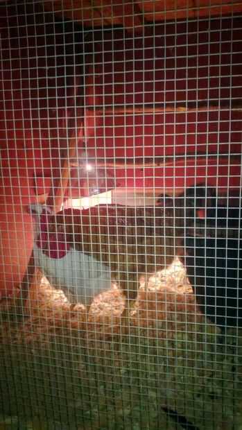 Los próximos 3 meses se gastan tratando de determinar cómo diablos puede mantenerlos de manchar sus alimentos y agua. Después de varios debates hemos decidido en un tubo de PVC de 4 pulgadas con una conexión Y en la parte inferior atada dentro de la cooperativa para su alimentación. Una vez que pudo salir de la cooperativa dejamos el agua fuera.