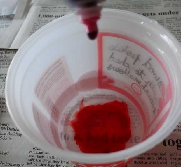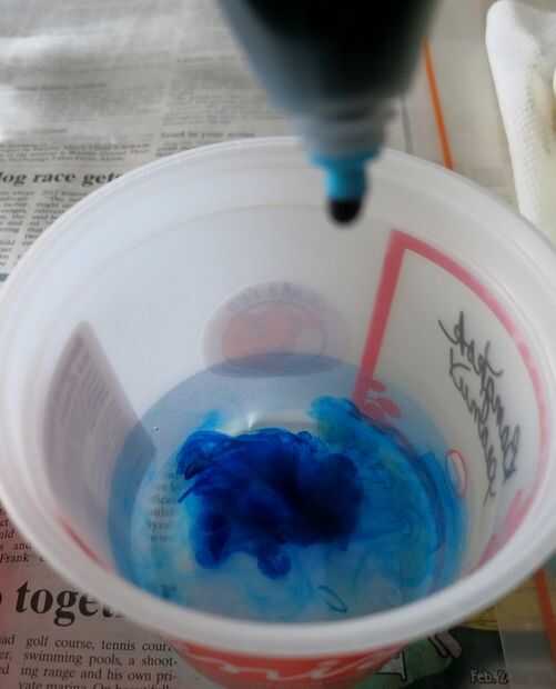 Entrar en mi método: para cada color usé 3 tazas. Para obtener un color base claro, utilicé 1 taza de agua caliente mezclada con vinagre blanco 1 cucharadita, luego añadí gotas de líquido color hasta llegar al color que quería. El azul y el rosa toman sólo 3 gotas de sus colores de neón para obtener luz azul y luz rosa, el verde y el amarillo toman 6 gotas. Utilizar la cuchara de plástico y mezcle bien.